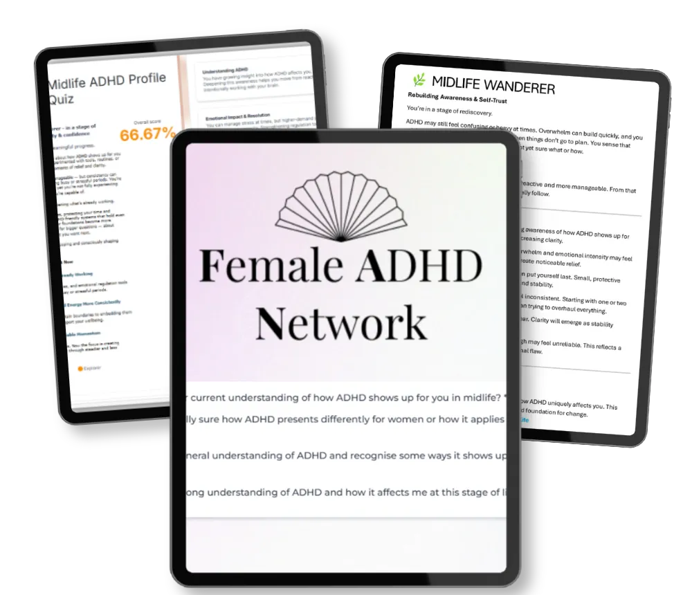 When you complete the Midlife ADHD Reset Audit, you’ll receive a personalised Midlife ADHD Profile Report, based on how ADHD and midlife pressures are interacting for you.