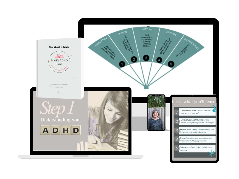 A supportive space where women in midlife can educate themselves about ADHD as it relates to them, together with relatable advice, practical ADHD-friendly strategies, tools + community and coaching to not only cope better, but to thrive in midlife.