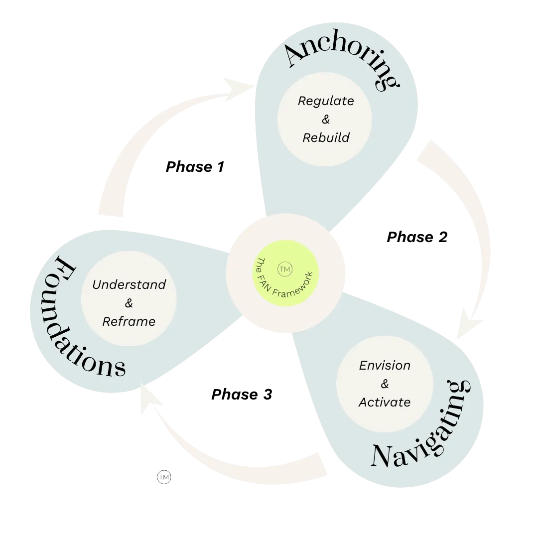 Blending coaching, community and my simple patented 3-phase coaching pathway — the FAN Method™ — designed to help women in midlife understand their brains, stabilise their lives, and create a next chapter they actually have the energy for.